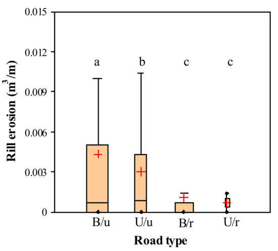 The volume of eroded soil per unit of road length was the highest for B/u roads (0.0043 ± 0.0076 m3/m) and the lowest for U/r segments (0.0007 ± 0.001 m3/m) (Figure 3). According to PERMANOVA, rill erosion was significantly different (Pseudo-F = 3.39, p < 0.05) among groups. Moreover, the pairwise comparisons showed significant differences between B/u and U/u roads (t = 2.69, p(perm) < 0.001), U/r and U/u roads (t = 2.16, p(perm) < 0.021) and U/u and B/r roads (t = 1.87, p(perm) < 0.031). Instead, the comparisons among the other road types were always not significant (p(perm) > 0.05). This means that, after wildfire, the burned roads made of unpaved materials are much more erodible compared to the other road types, and rill erosion may increase by more than 200% compared to rock-paved, and unburned and unpaved roads, and even by about 400% compared to only rock-paved roads. As demonstrated by different authors, the unpaved forest roads significantly alter hillslope hydrology by increasing and concentrating surface runoff and erosion [16,30].