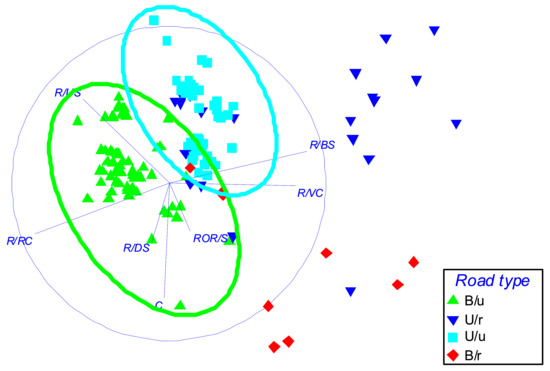 NDMS provided two derivative components (here called MDS1 and MDS2), which explain together 63.2% of the total variance of the original variables (road geometry and soil cover) (Figure 4). In more detail, all soil covers have high loadings on MDS1 (0.879 for R/BS, −0.851 for R/RC and 0.807 for R/VC). R/US (loading of −0.545), C (−0.731), R/US (0.535) and R/DS (−0.369) have instead significant loadings on MDS2. This statistical analysis therefore helps to identify two new meaningful variables, of which one (the MDS1) is clearly related to soil cover and the other (MDS2) to road geometry, and both discriminate the different characteristics of the four road types.