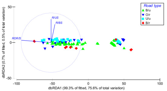 According to the variations (out of the fitted model and out of the total variation) explained by the axes of dbRDA, axis one (dbRDA1) applied to RE explained 99.32% of the fitted model and 76.1% of the total variance of RE among the four road types. The biplot of Figure 4 shows that ROR/S practically is the only variable that influenced dbRDA1 (given the high loading on this axis). The other two variables (R/US and R/BS) have a significant influence only on dbRDA2, which however explains only a very small share (0.7% of the fitted model and 0.5% of the total variation) of total variation of RE. Therefore, a reliable prediction model consisting of the ROR/S, R/US and R/BS variables may be adopted with satisfactory reliability, in order to predict, at least referring to the order of magnitude, the rill erosion rate in the analysed road types. This not only confirms the results of distance linear models applied in this study, but it is also in line with findings of the other authors; as a matter of fact [6,7,9,18], previously mentioned, have shown the importance of slopes of both road surface and upstream hillslope as well as bare soil presence as predictors of rill erosion in roads.