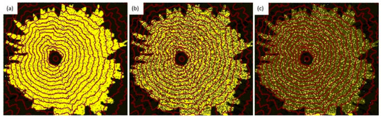 Effects of pyroclastic bombs: yellow cells are those not struck by pyroclastic bombs, gray cells are struck by at least one pyroclastic bomb. Time steps of the corresponding glacier melting simulation: (a) 2500, (b) 5000, and (c) 7500 steps.