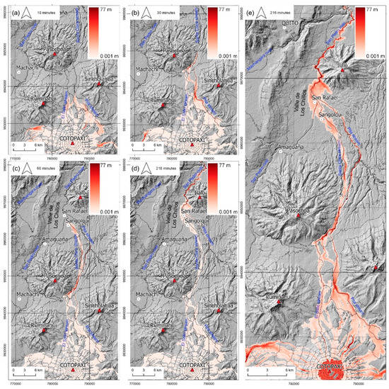 Figure 6 and Figure 7 depict the results of the debris thickness values as reached by the lahar in various steps of the simulations, for glacier thickness of 25 m and 50 m, respectively. The path of the lahar is similar to the previous scenarios, in both cases; however, the lahar maximum heights are much lower now, and a secondary branch bifurcating south of the Pasochoa volcano does not form. Ten minutes after the start of the eruption, the flows have already reached the lower slopes of the volcano, and the first laharitic fronts enter the towns of Sangolquí and San Rafael in about 60 min if a 25 m thick glacier is melted (Figure 6c) and in about 55 min if a 50 m thick glacier is melted (Figure 7c). Finally, after 108 min, the lahars (Figure 6d and Figure 7d), overflowing the banks of the Pita River, have already invaded the area around San Rafael and eventually channeled into the San Pedro River’s gorge.