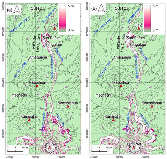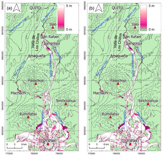According to historical records of the last Cotopaxi eruptive episodes, Barberi et al. [17] forecasted a probability as high as 0.7 of a novel eruption of Cotopaxi Volcano, which would currently impact the same area devastated by the 1877 northern lahars. This can be clearly seen in Figure 2, Figure 3, Figure 4, Figure 5 and Figure 6; in any case, the Valle de los Chillos area would be buried by a laharitic front several kilometers wide (along the east–west axis), several kilometers long (along the south–north axis), and several tens of meters thick, even in the most optimistic pyroclastic bomb scenario.