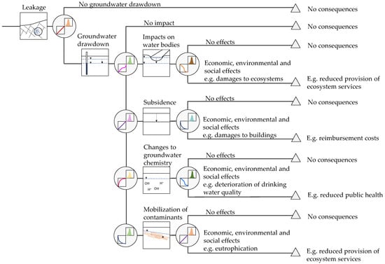 Event tree illustrating the cause–effect chain for several examples of effects and consequences caused by leakage into an underground facility. The circles represent the complex nonbinary relationship between the different events of the chain. The events can have economic, environmental, and social effects, which in turn result in consequences.