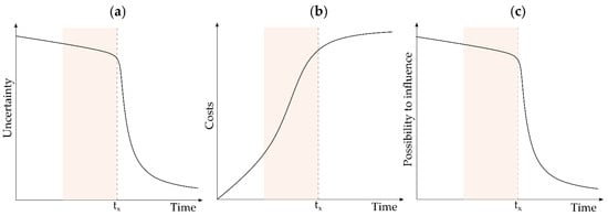 (a) level of uncertainty, (b) accumulated costs, and (c) the possibility to influence the outcome of the project in relation to the progress of the project in time. The colored area indicates the critical window where measures can be successfully implemented. At time tx, the project reaches a state where the room to maneuver and the chance to succeed with measures decrease. Modified from Lundman [21].