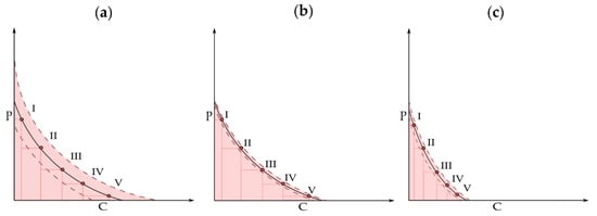 Schematic description of staircase and continuous risk functions indicated by red circles and black solid line together with an interval for uncertainty indicated by dashed lines. “P” and “C” indicate probability and consequence, respectively. (a) The risk curve; (b) the risk curve after retrieval of more information resulting in less uncertainty, and (c) the risk curve after implementation of risk-reducing measures resulting in reduced total risk.