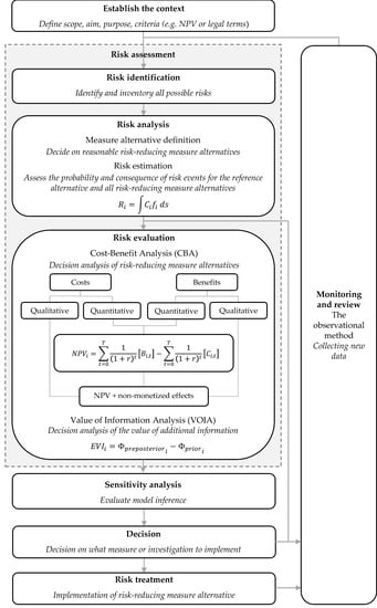 In addition to evaluating the need for implementing risk-reducing measures, the risk evaluation may also include the analysis of the value of additional information, i.e., value of information analysis (VOIA) [43,44,45,46,47]. VOIA is a CBA where the cost of collecting more information is compared with the expected benefits in terms of reduced risk for making erroneous decisions when choosing between risk-mitigation alternatives. In VOIA, as applied to the context here, additional information has value if it has the potential to change the decision on the risk-reduction alternative. A VOIA can mathematically be expressed as follows: