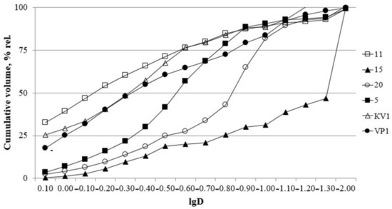 Cumulative curves. D—particle diameter, mm.