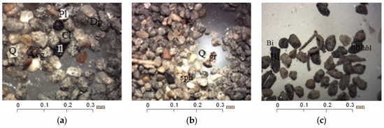Mineral composition of sand fraction studied with a binocular microscope: (a) Grains of quartz (Q), plagioclase (PI), chlorite (Cl), pyroxenes (Dp), amphiboles (Avg), ilmenite (I1) (Sample «11»); (b) grains of quartz (Q), sphene (sph), garnet (gr), and ferrous fragments of rocks (Sample «11»); (c) chitinous debris from insects, grains of biotite (Bi), clays, and fragments of rocks (Sample «VP1»).