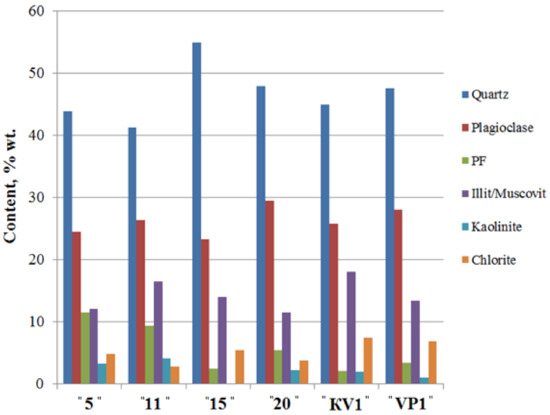 According to the XRD data, sediments are mainly composed of quartz and feldspar reaching up to 55% and 30% wt., accordingly (Figure 4, Table S2). Feldspars are generally represented by plagioclase (average ~ 26% wt.), whereas a content of potassium feldspar (PF) in the sediments is generally low (average ~ 6% wt.). Illite concentration fluctuates between 11 and 19% wt.