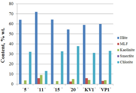 Clay minerals (Figure 5; Table S3; see X-ray diagrams in the Supplementary Materials) are represented by kaolinite, chlorite, and illite, and their total content does not exceed 27% wt. Mixed-layered Illite/Smectite (I/S) were found in samples taken from 11 and 20 m a.s.l., as well as in “VP1” and “KV1” samples.