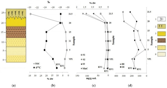 Change of parameters by cliff: (a) Lithologic column; (b) results of the determination of the total organic carbon (TOC) and its isotopic composition (δ13C); (c,d) data from the Rock-Eval pyrolysis. Legend: 1—above sea level, m; 2—sod-peat cover; 3—fine sand; 4—pelitic aleurite; 5—coarse sand; 6—medium sand.