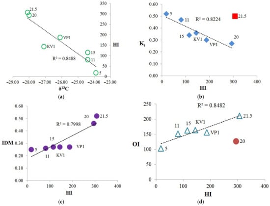 The relationships between Rock-Eval parameters, isotopic composition, and Ki: (a) isotopic composition (δ13C) vs. hydrogen index (HI); (b) Ki vs. hydrogen index (HI), with sample “21.5” falls out from trend, Ki represents the (Pr + Ph)/(nC17 + nC18) ratio; (c) diagenetic maturity index (IDM) vs. HI; (d) oxygen index (OI) vs. HI, while sample “20” falls out from trend.