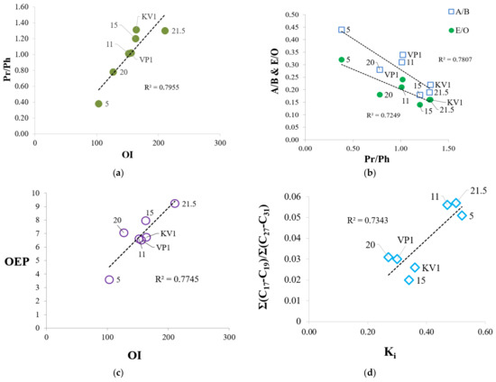 Relationships between Rock Eval parameters and biomarker coefficients determined from GC-MS analysis: (a) Relationship between OI and Pr/Ph; (b) dependence of A/B and E/O parameters on Pr/Ph; (c) dependence between OEP oddness index and OI oxygen index; (d) relationship between proportion of low-molecular alkanes (Σ(C17-C19)/Σ(C27-C31)) and Ki index (Ki = (Pr + Ph)/(nC17 + nC18)).