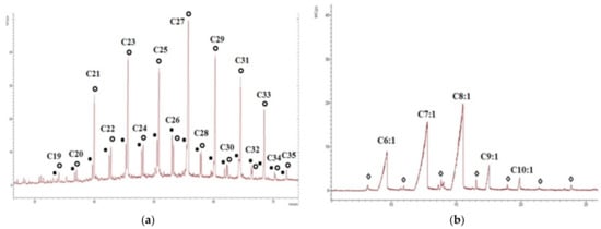 Chromatograms of the aliphatic and polar fractions of the sample “21.5”: (a) The distribution of n-alkanes and n-alkenes in the aliphatic fraction (m/z 57), where black dots denote alkenes, open circles denote alkanes); (b) the distribution of monounsaturated fatty acids (m/z 73) in the polar fraction, where open rhombuses indicate the saturated fatty acids.