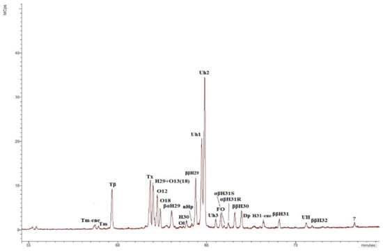 Chromatogram m/z 191 of the aliphatic fraction of the sediment sample collected at the cliff level of 20 m. Tm-ene—17α(H)-22,29,30-tris-norhop-(17,21)-ene; Tm—17α(H)-22,29,30-trisnorhopane; Tβ—17β (H)-22,29,30-trisnorhopane; Tx –taraxerene (D:A-Friedolean-14-ene); H29—17α(H), 21β(H)-30-norhopane; O13(18)—olean-13(18)-ene; O12—olean-12-ene; O18—olean-18-ene; βαH29—17β(H), 21α (H)-30-norhopane (normoretane); Ol—oleanane; H30—17α(H), 21β(H) C30 hopane; nHp—neohop-13(18)-ene; ββH29—17β(H), 21β(H)-30-norhopane; Uh1—unidentified C30 hopene №1 (unknown hopene); Uh2—unidentified C30 hopene № 2 (unknown hopene); Uh3—unidentified C30 hopene №3 (unknown hopene); FO—D:A-Friedolean-6-ene; αβH31S and αβH31R—C31 17α(H), 21β(H) homohopanes 22S and 22R epimers, respectively; ββH30—C30 17β(H), 21β(H)-hopane; Dp—diploptene (C30 hop-22(29)-ene); H31-ene—C31 homohop-30-ene; ββH31—C31 17β(H), 21β(H)-homohopane; UH—unidentified hopane (unknown hopane); ββH32—C32 17β(H), 21β(H)-homohopane.