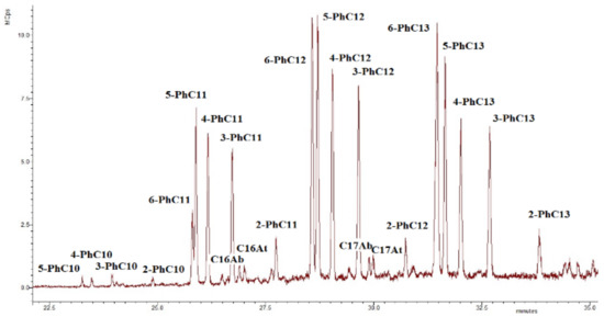 Alkylbenzenes found in the investigated sediments are mainly phenylalkanes (m/z 91, see Figure 11), and C16, C17 n-alkylbenzenes, and alkyltoluenes are also present in the sediments [59].