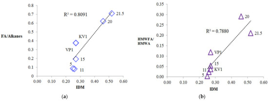 Relationships between IDM index and indexes based on relation fatty acids to n-alkanes: (a) Correlation between IDM and FA/Alkanes ratio; (b) correlation between IDM and high molecular weight n-fatty acids (HMWFA)/high molecular weight n-alkanes (HMWA) ratio.