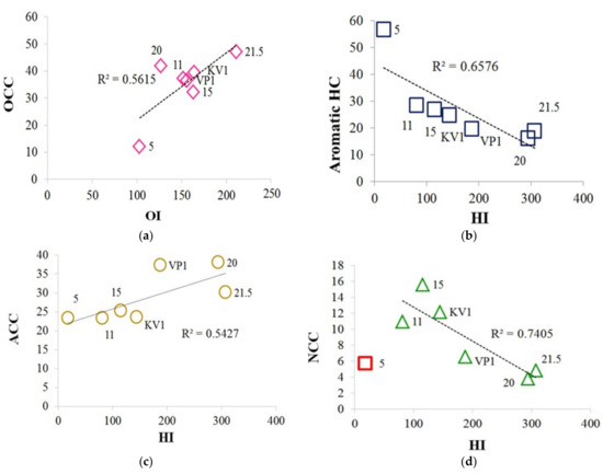 Correlations between the composition of the Py-GC-MS pyrolysis products and the Rock-Eval parameters: (a) Relationship between the oxygen-containing compounds (OCC) and the oxygen index (OI); (b) relationship between the content of the aromatic HC and the hydrogen index (HI); (c) relationship between the aliphatic-containing compounds (ACC) and the hydrogen index (HI); (d) relationship between the nitrogen-containing compounds (NCC) and the hydrogen index (HI); sample “5” falls out from the trend.