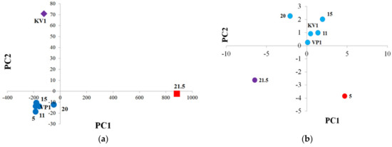 PCA of the sediment samples of the Cape Muostakh: (a) PCA with including all parameters—purple rhombus means sample "KV1", red square means sample "21.5", other samples are marked with dark blue circles (“5”, “11”, “15”, “20”, “VP1”); (b) PCA with including only the results of the pyrolytic methods of analysis—purple circle means sample "21.5", red circle means sample "5", other samples are marked with blue circles (“11”, “15”, “20”, “VP1”, “KV1”).