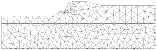 15-Node triangular elements were used to model soils and other volume clusters. According to the two-dimensional finite-element model, only two translation degrees of freedom per node were considered (along x and z directions). Considering the variation of the depth of the weak layer (zi, Figure 1), and considering the variations of the constitutive parameters of materials (Table 1), about 800 FE simulations were carried out. One of the FEM meshes used, the one relating to the case of zi/H = 1.18 is shown in Figure 2.