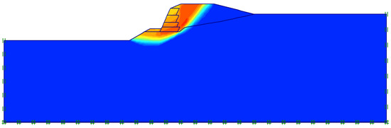 Distribution of the total displacements at failure calculated for the case of homogeneous foundation soils (c′1 = 10 kPa and φ′1 = 30°), by means of the phi-c reduction stage. The colorimetric scale is not plotted in the figure because, as is well known, the intensity of displacement at failure calculated by the model is an unrealistic result, due to the elastoplastic constitutive soil model adopted in the simulations. However, this representation is effective in pointing out the volume of materials involved in the failure (volume in which the displacements and the deformation are concentrated).