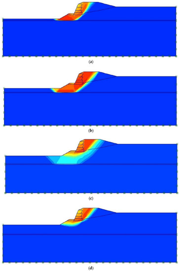 Figure 6 shows the calculated total strains for the same four cases, involving the weak layer, which were presented before. These representations show that the weak layer experiences the highest axial strain values when it affects the failure mechanism (Figure 6a–c). The unstable soil mass horizontally slides on the weak layer due to the shear strain experienced by the weak materials. This proves the fundamental role of the weak layer on the mechanical behaviour of the studied geotechnical system and, in particular, its effect on the global stability of the embankment and on the geometry of the failure mechanisms.