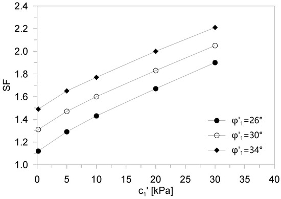 As reported before, to provide reference values of the safety factor (SF), preliminarily, the FE analyses were conducted considering homogeneous foundation soils. Figure 7 shows the evolution of the safety factor with intercept cohesion c′1, for different values of the shear strength angle φ′1 (26°, 30° and 34°) of foundation soils. Obviously, the safety factor increases both with intercept cohesion and with the shear strength angle. The similar trend of the curves proves that, in this case, the failure mechanism is not dependent on the shear strength parameters.