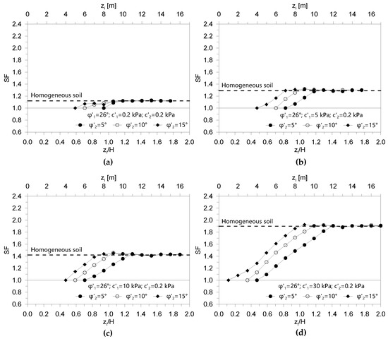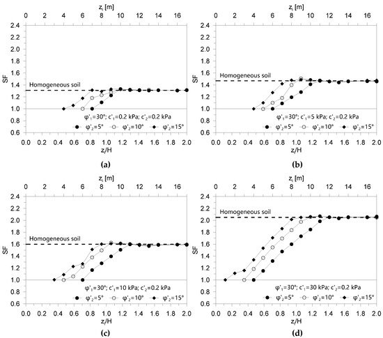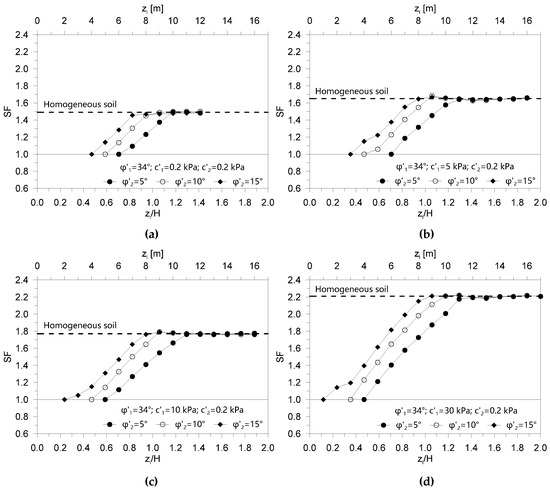 Safety factor SF as a function of the geometrical variable zi/H for φ′1 = 30° and c′1 = 0.2 kPa (a), c′1 = 5 kPa (b), c′1 = 10 kPa (c) and c′1 = 30 kPa (d), for different values of the shear strength angle φ′2 (5°, 10° and 15°).