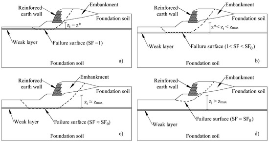 Significant scenario representing the failure mechanism and the stability condition of the embankment in the case of the weak layer located at different depths. The weak layer affects both the failure mechanism and the safety factor: (a) weak layer located at depth zi equal to the critical depth z* (SF = 1); (b) weak layer located at depth zi between the critical depth z* and the maximum depth zmax (1 < SF < SF0, where SF0 is the safety factor in case of homogenous foundation soil); (c) weak layer located at depth equal to the maximum depth zmax (SF ≈ SF0); (d) weak layer located at a depth higher than the maximum depth zmax (SF = SF0).