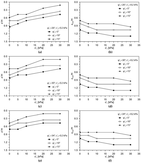 The parameters of the weak layer depth z* and zmax depend on the shear strength of the involved soils (both foundation soil and weak layer soil). According to this, the ratio between the critical depth z*and the height of the embankment H (z*/H) is plotted as a function of the intercept cohesion of the foundation soil c’1 and of the shear strength angle of the foundation soil (φ′1 = 26° in Figure 13a, φ′1 = 30° in Figure 13c and φ′1 = 34° in Figure 13e). The different values of the shear strength angle of the weak layer (φ′2 = 5°, 10° and 5°) are considered in the same figures. Similarly, the values of the ratio between the maximum depth zmax and the height of the embankment H (zmax/H) are plotted in Figure 13b (φ′1 = 26°), Figure 13d (φ′1 = 30°) and Figure 13f (φ′1 = 34°).