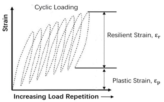 As a universal technique to simulate the dynamic response of pavement materials in the laboratory environment, the repeated load triaxial test (RLT) is commonly suggested to evaluate the pavement material behavior under specific traffic loading magnitude and frequency, which are stipulated by standards such as Standards Australia and Austroads [1,2]. Compared with other testing techniques such as the California bearing ratio (CBR), unconfined compression strength, and triaxial shear strength, RLT could observe the dynamic response of materials under a relatively low repeated loading level under a simulated stress state [30]. Lekarp et al. [31,32] and Castelli [33] presented the dynamic behavior of UGMs and subgrade soils under the repeated wheel loads of RLT test equipment. Under the repeated wheel loads, the UGMs showed a complex nonlinear behavior (time-dependent elastoplastic response) that has been studied by many researchers through experiments [5,19]. A theoretical assumption of the response of a characteristic pavement element under cyclic loading separated the strain response into a resilient strain (recoverable deformation) and plastic strain (permanent deformation) components according to whether the component of strain can recover during the unloading process, as shown in Figure 1. Under repeated loading conditions, the strain response is generally assumed where the resilient strain is mainly elastic and the plastic strain is defined by the accumulation of the plastic strain under cyclic loading [34]. With the increase in the number of cycles, the plastic strain induced by each load application decreases, and the plastic component of strain tends to accumulate continuously [31,34]. The accumulation characteristics of plastic strain are commonly logarithmic with an increasing number of cycles [35]. Therefore, it leads to the potential rutting phenomenon, which affects the pavement structure and traffic conditions, as discussed above [31,32]. The residual performance of the pavement materials is the key parameter that is useful to define the residual performance capacity of the pavement under the imposed long-term traffic loads [33]. Under a large number of cycles, the tested specimen would present degradation phenomena with a sudden decrease in its mechanical characteristics and large strain level [33].