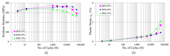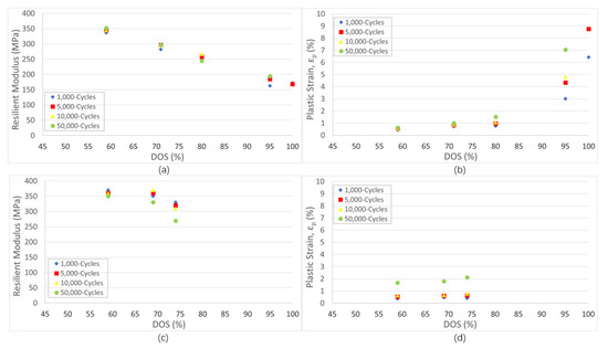 Similarly, as illustrated in Figure 7c, for a certain number of cycles up to 50,000, the resilient modulus of the tested aggregates adopting a vertical deviator stress of 625 kPa also approximately linearly reduced with the increase in DOS from 69% to 74%. As indicated in Figure 7d, with a certain number of cycles, an approximately positively linear relationship was observed between the plastic strain and the DOS of the specimens imposed a vertical deviator stress of 625 kPa. The relatively linear response illustrates the onset of moisture sensitivity with the increase of plastic strain.