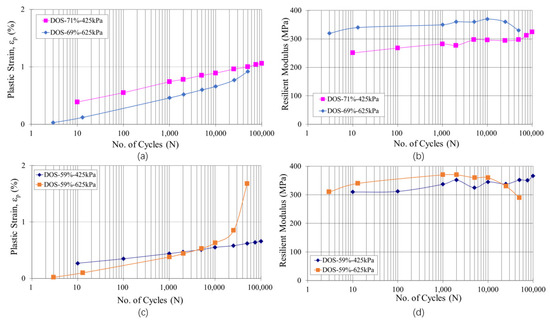 To analyze the effect of the DOS on the resilient modulus and the plastic strain accumulation, Figure 6a–d provides more detailed comparisons of the results corresponding to vertical repeated deviator stresses of 425 kPa and 625 kPa under similar DOS. As shown in Figure 6a, under a similar DOS of around 70%, the sample imposed a deviator stress of 425 kPa accumulated a larger plastic strain than the specimen under the deviator stress of 625 kPa before 50,000 cycles. However, with the increase in the number of cycles, the rate of the plastic strain accumulation increased significantly for the sample under a high-stress level.