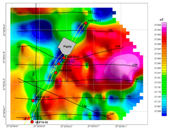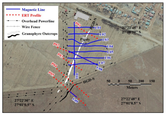 Ground magnetic data were recorded across HGD-N on a grid consisting of seven lines with west–east orientations (L01 to L07), one line perpendicular to the outcrop (L08), and a single tie-line (T01) with a south–north orientation (Figure 3). The purpose of line L08 was to accurately define the shape of the magnetic anomaly associated with the dike. An attempt was made to also record magnetic data on a line (L09) perpendicular to the outcrop of HGD-S; however, an overhead powerline that runs approximately parallel to this part of the dike caused excessive electromagnetic noise, preventing the line from extending across the dike.