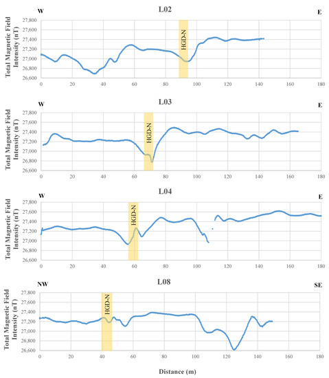 A strong magnetic response was recorded across HGD-N. The magnetic anomaly associated with the dike displayed a large negative trough above the dike with a smaller positive peak immediately east of the dike. Examples of the magnetic data recorded along lines L02, L03, and L04 are presented as profile plots with the position of the dike indicated (HGD-N; Figure 5). Although the dike anomaly had an amplitude of several hundreds of nanotesla (nT), other magnetic anomalies with amplitudes exceeding 500 nT were observed over the basement rocks to the west (L02) and east (L04) of the dike. The magnetic data recorded perpendicularly across the dike on L08 displayed similar properties to the other profiles (Figure 5). The dike yielded a negative magnetic anomaly, which was dominated by a more prominent negative anomaly located to the southeast of the dike.