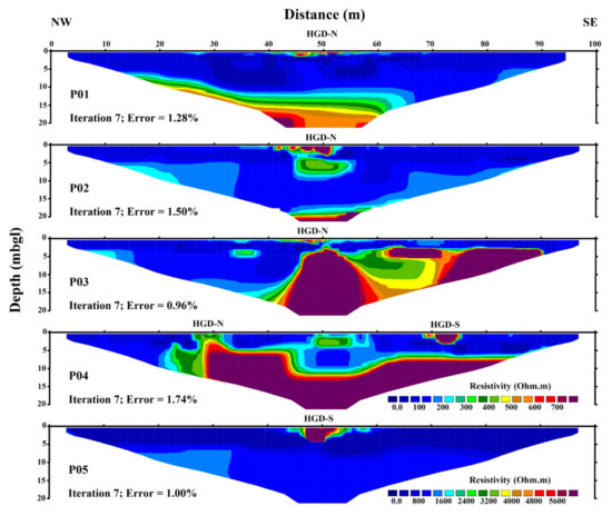 An ERT survey was done on five profiles that were approximately perpendicular to the outcrops of HGD-N and HGD-S (P01 to P05 lines in Figure 3). Apparent resistivity data were recorded using the Lund Imaging System (Terrameter SAS1000, Electrode Selector ES10-64C and multicore cables) supplied by Guideline Geo AB. A unit electrode spacing of 2.5 m was employed on profiles P02, P04, and P05, while a unit electrode spacing of 1.25 m was used on profiles P01 and P03 to allow for a higher spatial resolution. Profiles P02, P04, and P05 thus had lengths of 200 m, whereas profiles P01 and P03 were 100 m long. The Schlumberger electrode geometry was used on all profiles.