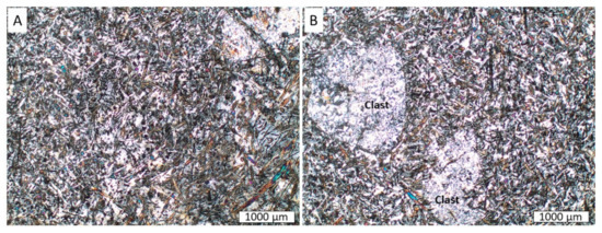 Figure 8. (A,B) Photomicrographs in crossed-polarized light (XPL) of the thin section representing typical HGD-S (fine-grained intersertal to porphyritic igneous texture as in [13]). The light domains are lithic clasts, predominantly composed of mosaic quartz.