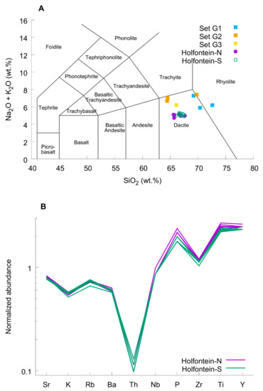 The granophyre samples showed little variation in composition and were similar to previously published bulk analyses of the Vredefort granophyre [12,13]. For both HGD-N and HGD-S, there was no statistical difference in the abundances of major elements. The granophyre had a major elemental composition of 66.7 ± 0.6 wt.% SiO2, 12.6 ± 0.2 wt.% Al2O3, 7.1 ± 0.2 wt.% Fe2O3, 3.6 ± 0.1 wt.% CaO, 2.7 ± 0.1 wt.% Na2O, and 2.3 ± 0.1 wt.% K2O. The trace element compositions of the HGD-N and HGD-S were also similar (Table 1), with both dikes having a Cr/Ni ratio of 2.0. Using the Total Alkali-Silica (TAS) classification scheme [27], the Holfontein granophyre was identified to be dacitic in composition (Figure 10A). The high-field-strength elements (HFSE) for both HGD-N and HGD-S had identical patterns (Figure 10B).