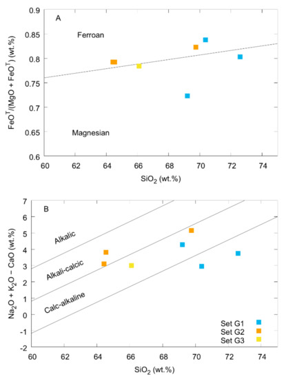 Figure 12. Classification of the granitoid samples in this study using the scheme of [28]. The granitoids varied between magnesian and ferroan (A) and ranged from calc-alkaline to alkali-calcic, but were not alkalic (B).