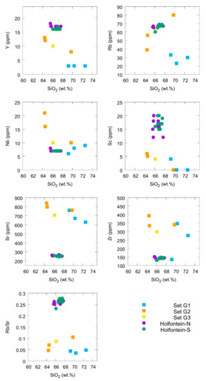 Samples from the Holfontein Granophyre Dike and surrounding granites were analyzed for major and trace elements in the wavelength-dispersive X-ray fluorescence spectrometer (WD-XRF) laboratory at the Department of Geology, University of the Free State. Samples were crushed into a powder, which was used to prepare fusion discs (used for elements of major quantities) and pressed pellets (used to measure Na and trace elements). The chemical analyses of major elements were conducted with the sequential PANalytical Axios WD-XRF machine using “IGS majors” and “Sodium only” applications accordingly. The XRF data for trace elements were obtained from the pressed pellets on the same spectrometer using an end-window Rh X-ray tube. Calibration was performed using a set of 20–40 well-characterized natural rock standards that were issued by agencies such as the United States Geology Survey (USGS), Geochemical Reference samples Database (GSJ), and Mintek. Raw data were processed with the X-ray analyses software SuperQ 4.0R with the toolbox for trace elements Pro-Trace (PANalytical B.V.). The statistical method applied to the obtained analyses was a two-tailed t-test, p < 0.0001.