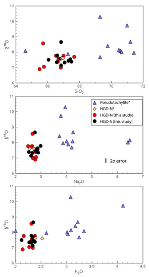 Figure 14. Plots of the δ18O value vs. SiO2, Na2O, and K2O for granophyre samples. * Data points for HGD-N* and pseudotachylite veins from the Vredefort Impact Structure from [30].