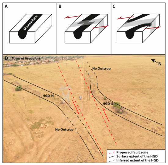 Figure 16. Schematic diagrams and annotated expression of the Holfontein Granophyre Dike with the proposed strike-slip sinistral fault zone. Schematic diagrams A–C show intact (A), intermediate (B), and final (C) stages of shearing of the HGD. (D) Aerial photograph of the HGD showing the proposed orientation of the fault zone.