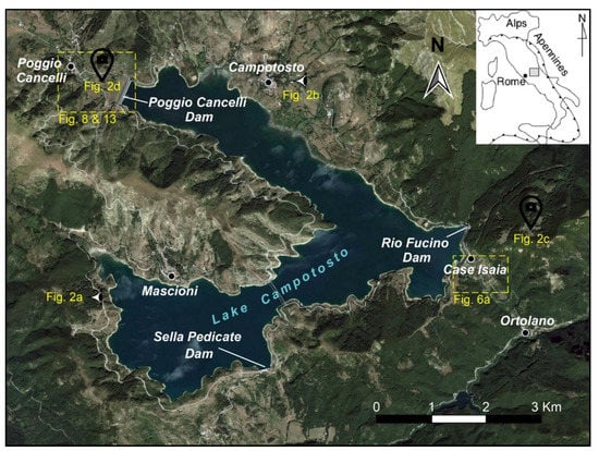 The Lake Campotosto basin is located in the Central Apennines, between the Gran Sasso d’Italia Massif (in the south) and the Laga Mts. (in the north). The Campotosto basin hosts an artificial reservoir, which covers 14 km2 with a depth of 30–35 m, at an altitude of 1313 m a.s.l. Lake Campotosto represents a hydroelectric plant’s head reservoir into which converge the natural inflows of the catchment basin directly subtended by the lake, by the slopes of the surrounding mountain systems, and by the presence of the middle sector of the Vomano river; it is bordered by three artificial dams: (i) Rio Fucino dam on the eastern corner; (ii) Poggio Cancelli dam on the northern corner; (iii) Sella Pedicate dam on the southern side.