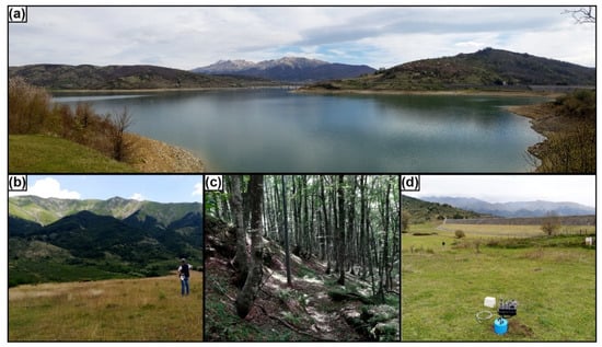 Panel of photographs of the study area: (a) Panoramic view of Lake Campotosto with, on the right, the Sella Pedicate dam and, in background, the Gorzano Mt. fault system; (b) view of the Gorzano Mt., where the triangular facets roughly indicate the Gorzano Mt. fault trend; (c) lowered ground surface indicating a main trench in the upper part the deep-seated gravitational slope deformations DsGSD (ID.9) of Figures 4 and 5; (d) seismic ambient noise measurement carried out in the Poggio Cancelli valley with, in background, the Poggio Cancelli dam.