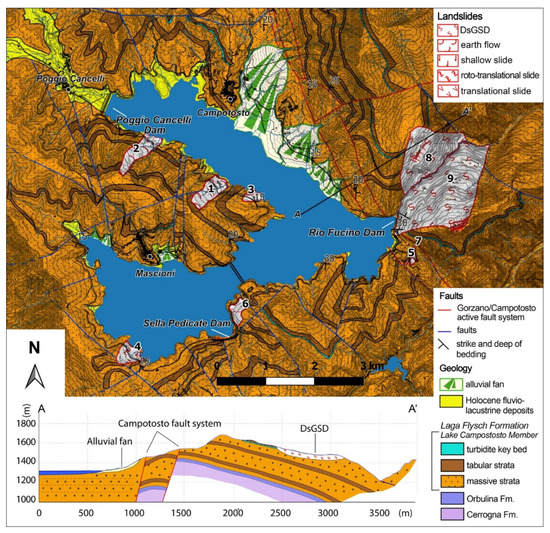Map of the geomechanical features of the Lake Campotosto basin; section A–A’ across the active fault system in the bottom panel.