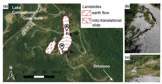 Landslides ID.5 and ID.7 (Figure 6a), classified respectively as a roto-translational landslide and earthflow, were identified in the eastern part of the study area. Such slides do not directly interfere with Lake Campotosto, but they show some evidence of recent reactivation. In particular, these landslides were activated after 2010, as they are not present in the aerial photos of the “Abruzzo 2010” flight, and probably date back to the winter of 2016, following heavy snowfalls. The roto-translational landslide ID.5 involves the road that links Lake Campotosto to Ortolano town, displacing the road surface by several meters and completely interrupting the road system (Figure 6b,c). According to the report of EMERGEO Group of National Institute of Geophysics and Volcanology (INGV) on the coseismic effects of the seismic sequence of Central Italy of 2016–2017 [], this slide was reactivated by the seismic events that occurred in August 2016.