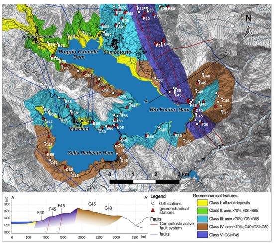 Figure 7 shows a geomechanical profile, which also reports the most significant GSI values. The geomechanical cross-section was drawn orthogonal to the direction of the Campotosto faults in order to highlight the variation of the rock mass characteristics as a function of the distance from the main tectonic element.