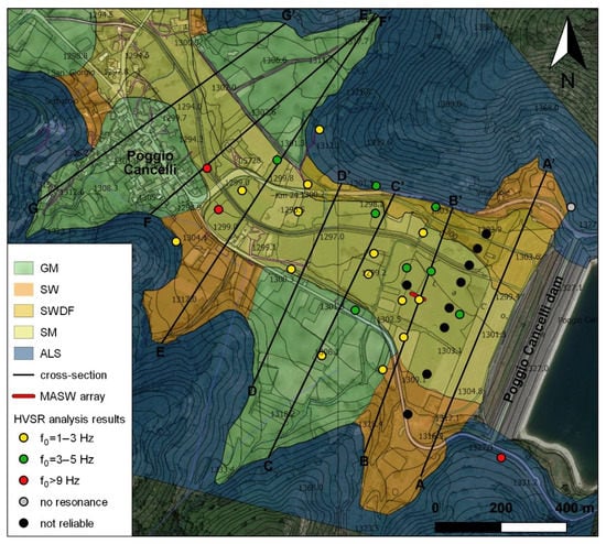 Figure 8 also shows the main results obtained by the HVSR analysis on the single-station seismic ambient noise measurements performed in the Poggio Cancelli area; the HVSR functions satisfied the reliability criteria provided by SESAME [] for 26 measurements, whose results were examined considering the different outcropping lithologies on which they were performed.