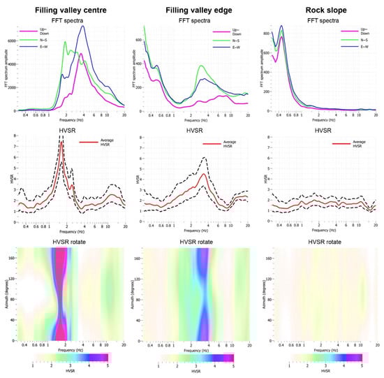 Examples of fast Fourier transform (FFT) spectra, horizontal-to-vertical spectral ratio (HVSR) function (the dashed black lines show the standard deviation of the curve), and HVSR rotate plot at the Poggio Cancelli valley obtained on fluviolacustrine deposits (left panel), alluvial fan (middle panel), and Laga Fm. flysch (right panel).