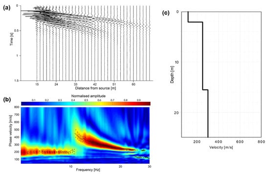 Multichannel analysis of surface waves (MASW) survey results: (a) shot-gather with source 15 offset; (b) dispersion image in the f–c domain with identification of both fundamental and first higher mode of Rayleigh wave; (c) best model Vs profile resulting from Rayleigh wave dispersion curve inversion.